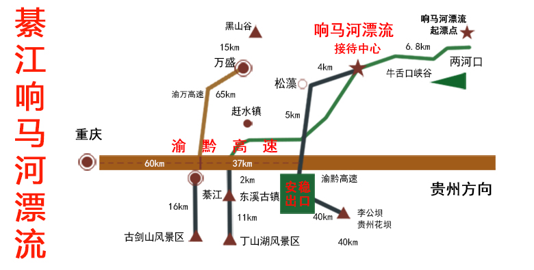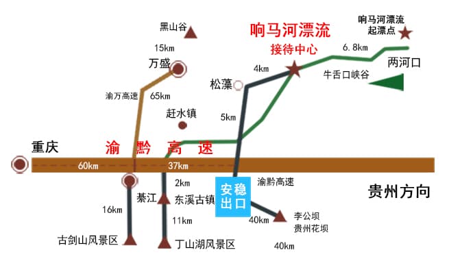 重庆出发(内环高速)→上G75渝黔高速→綦江→往遵义、贵州方向行驶(全程约90分钟车程,渝黔高速安稳出口下道)经过崇溪河收费站后在安稳出口下道,下道后沿景区指引路牌行驶约10公里即到响马河漂流景区。