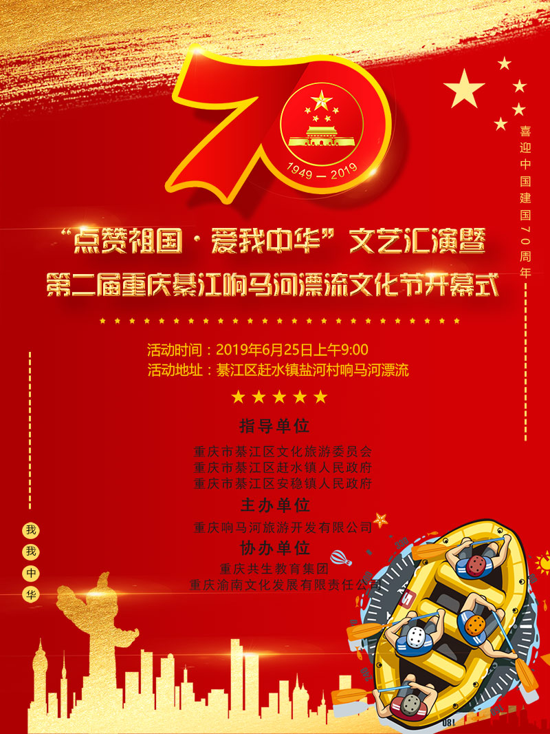 大力弘扬爱国主义精神,不忘初心跟党走,奋勇建功新时代。由重庆市綦江区文化和旅游发展委员会(体育局)、重庆市綦江区赶水镇人民政府、重庆市綦江区安稳镇人民政府指导,重庆响马河旅游开发有限公司于2019年6月25日在綦江响马河漂流景区举办隆重、热烈、务实、节俭的庆祝活动。